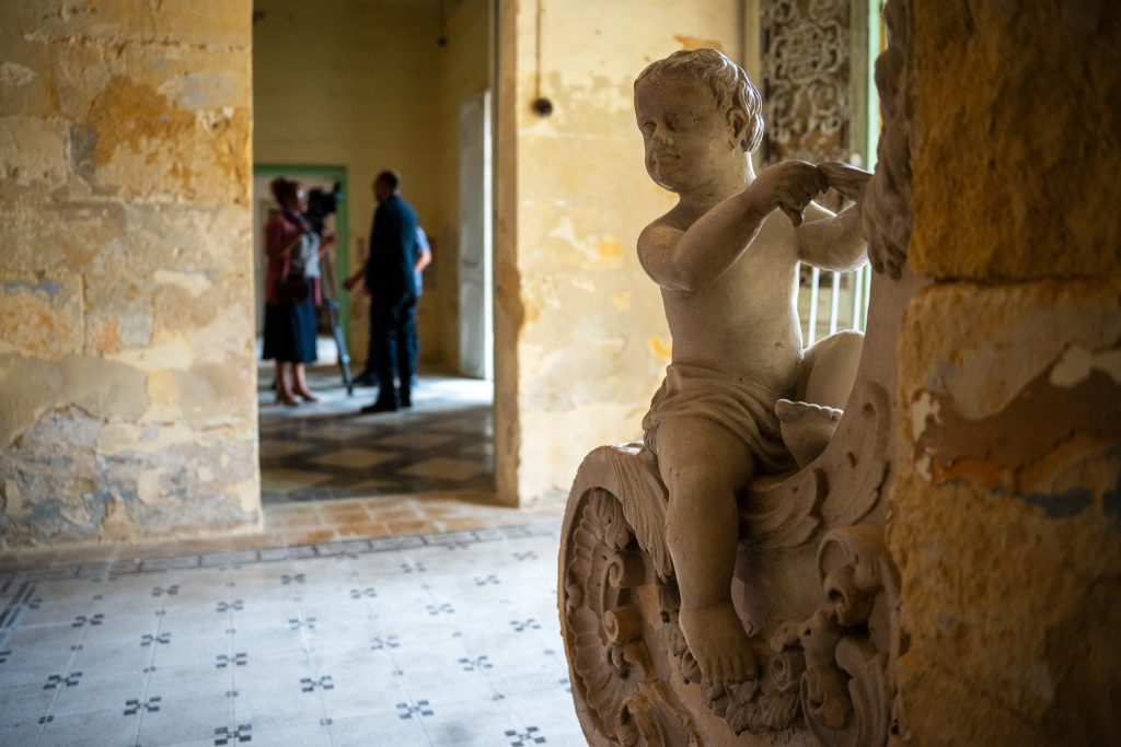 Among other tasks already completed in the villa, sections of the façade that were in imminent danger of collapse were shored up, and other parts of the building were reinforced to halt ongoing damage. A detailed architectural survey of the entire property was undertaken and tonnes of debris and other materials were removed. Stone statues that once decorated the garden, as well as domestic appliances used in the villa in the 1940s and 50s were conserved by Heritage Malta after years of neglect. Decorative schemes on the walls of the villa were uncovered and will now be restored.